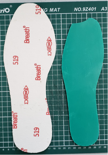 中底板→单面上胶YWX21→80℃ⅹ3-5mins→贴合乳胶材料→按压定型